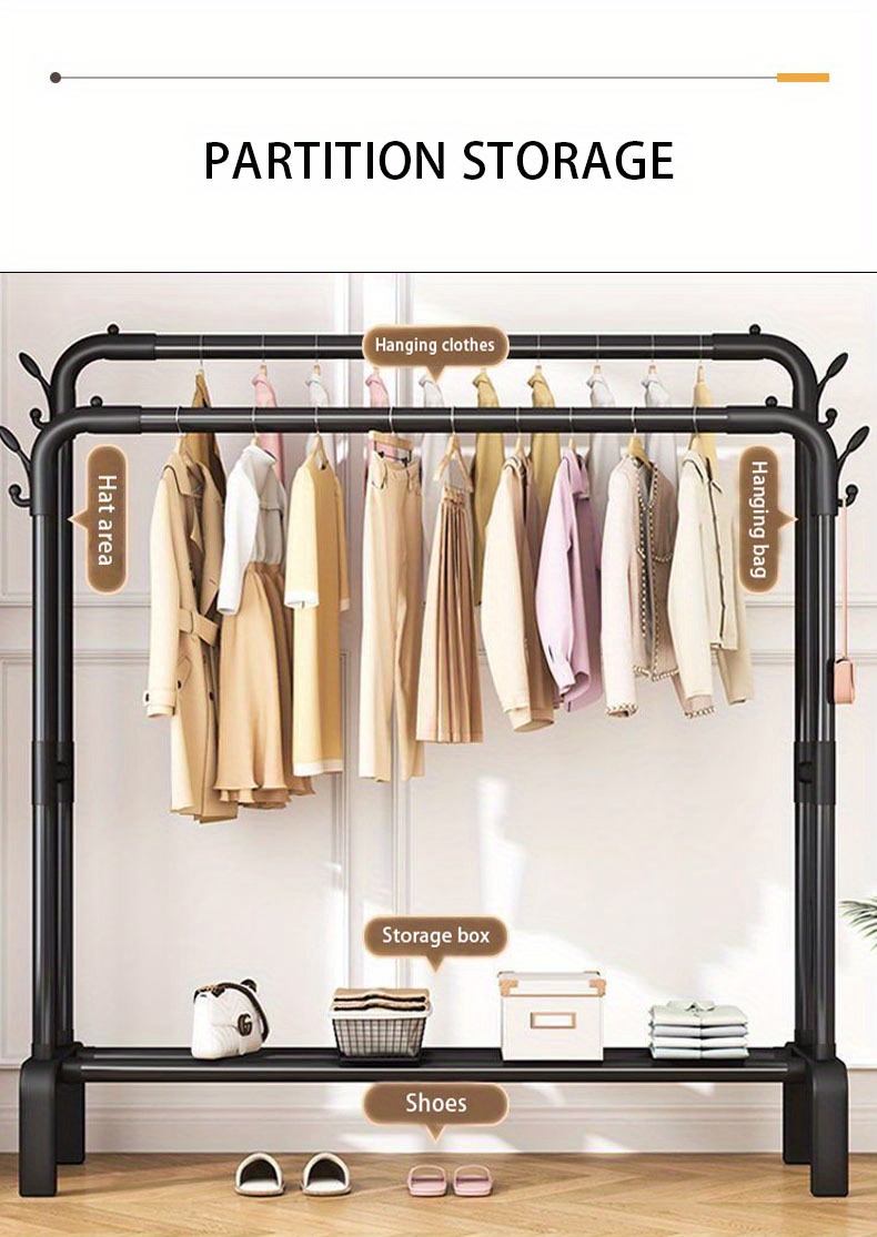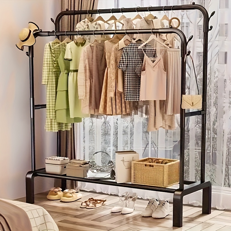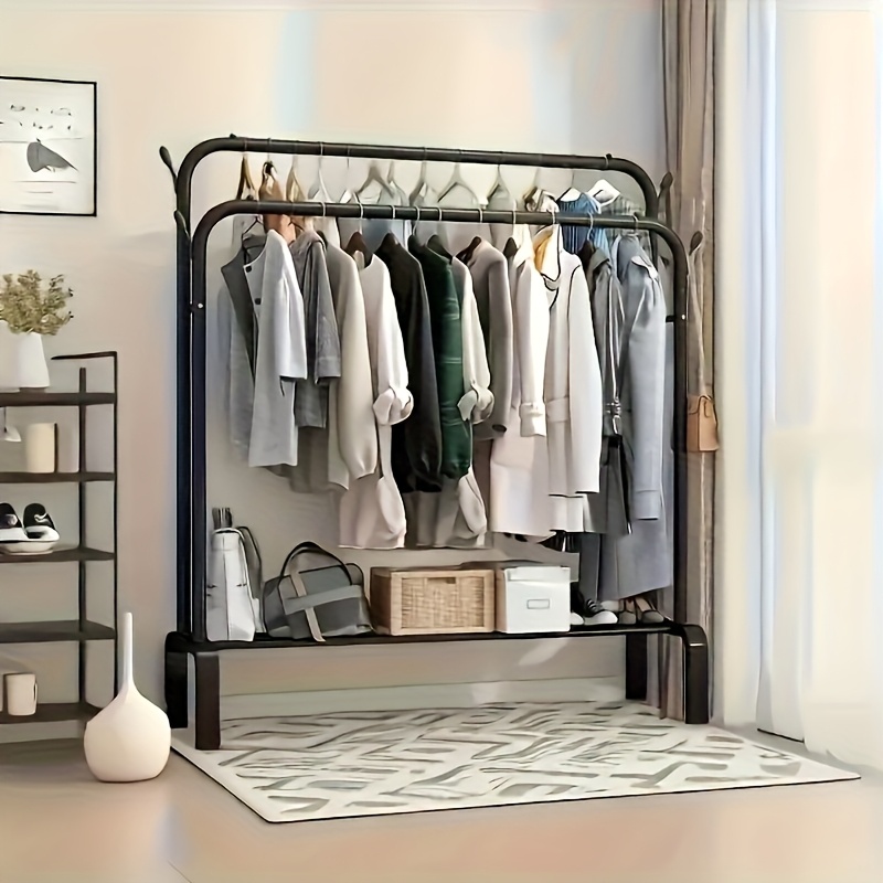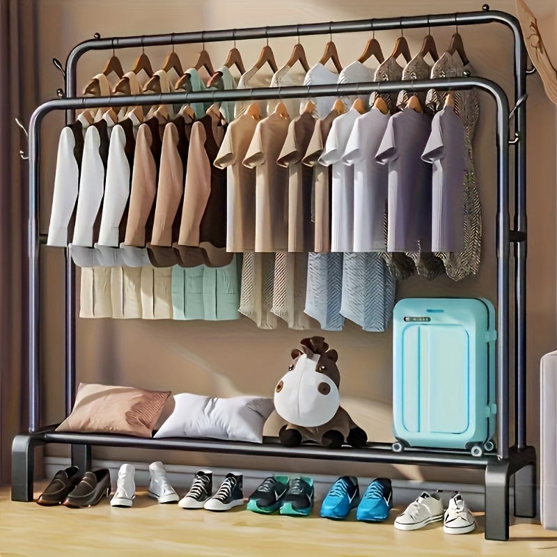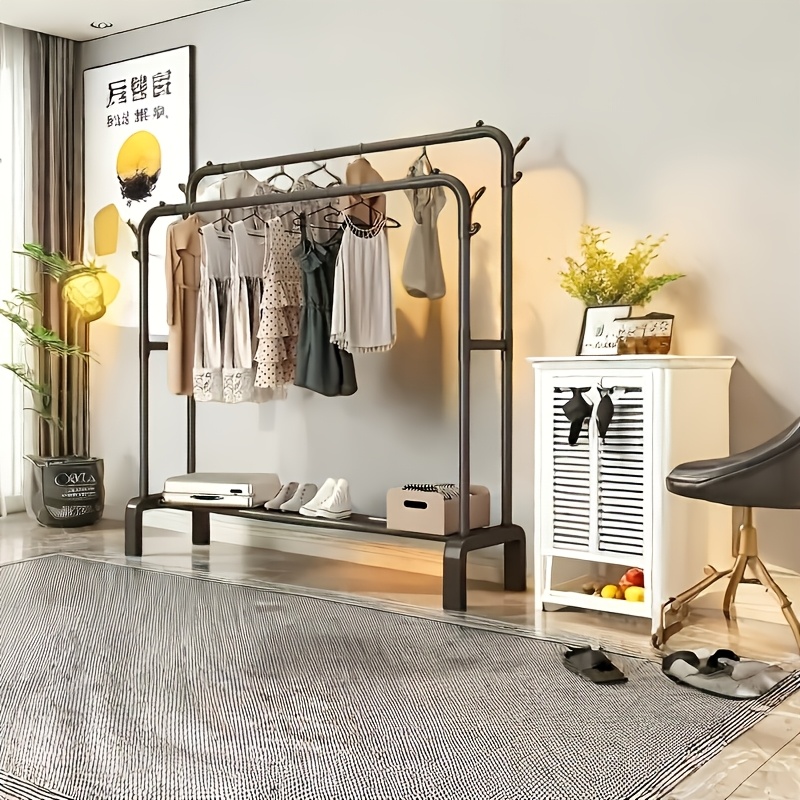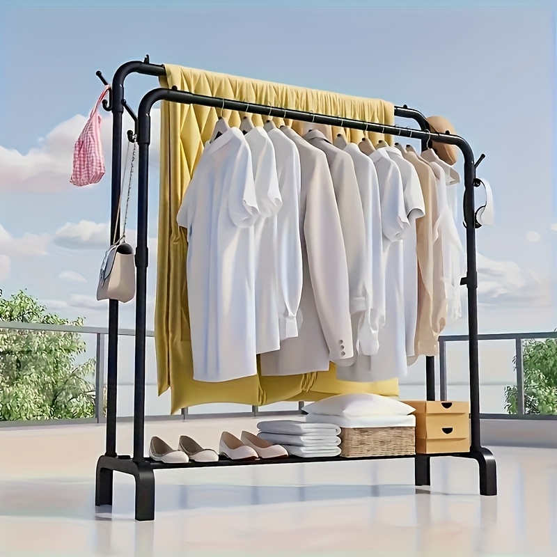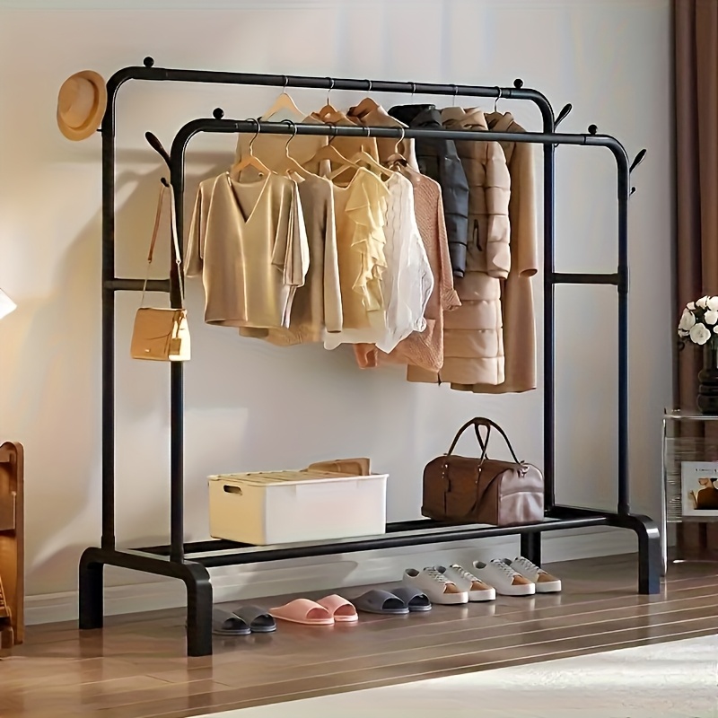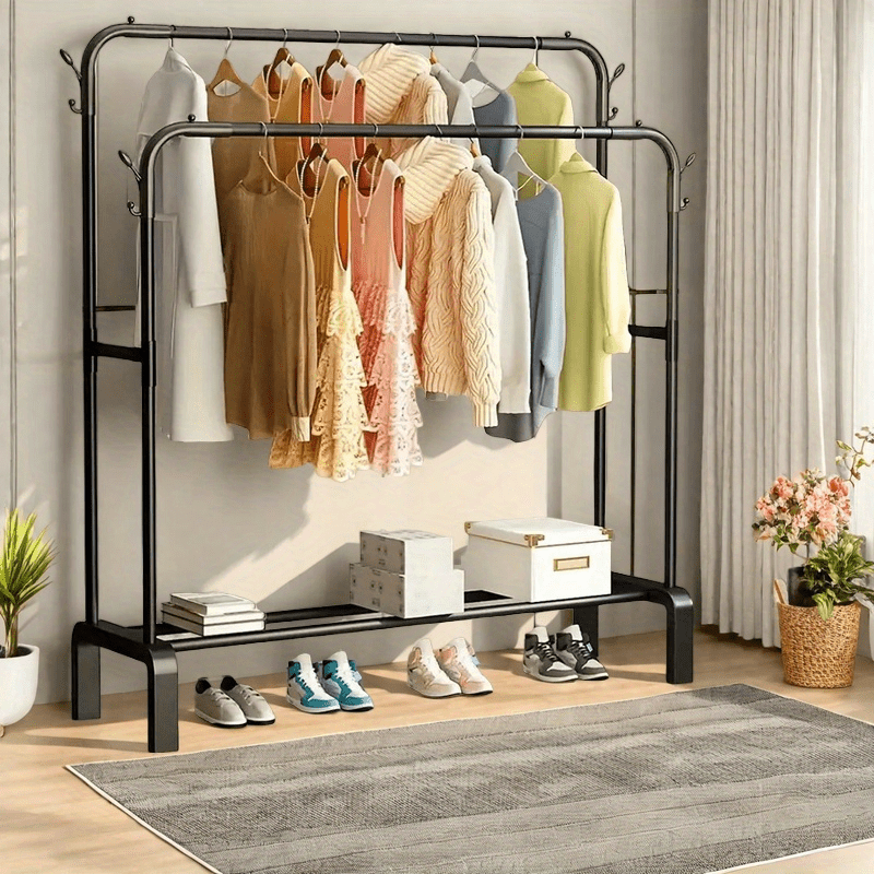 Introducing the Double Pole Cloth Hanger with Hat Hook & Shoe Rack — the perfect complement to your wardrobe and daily routine!