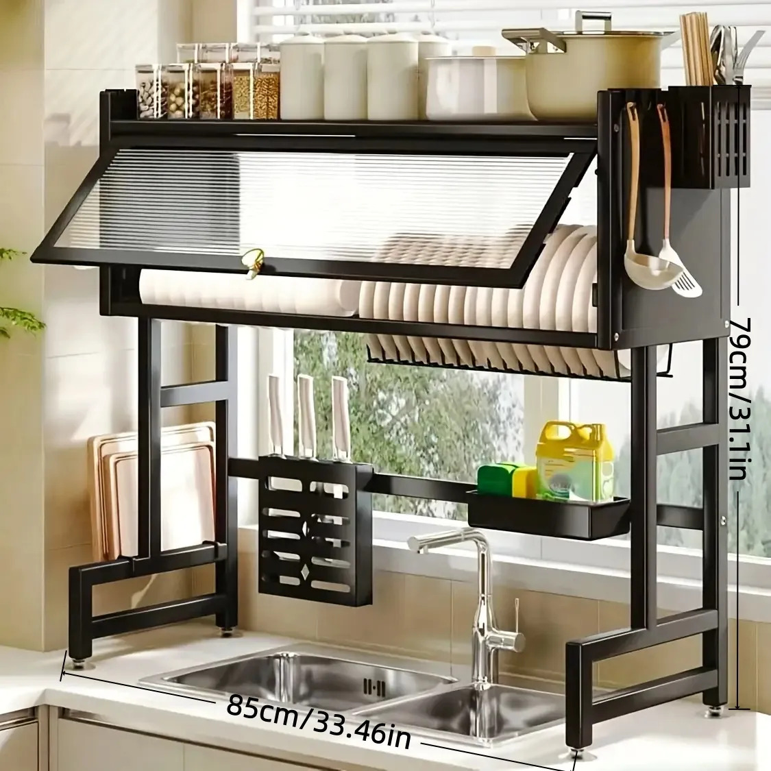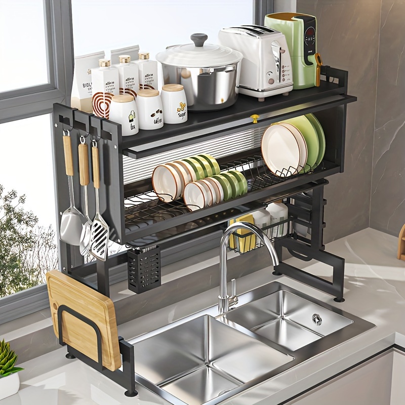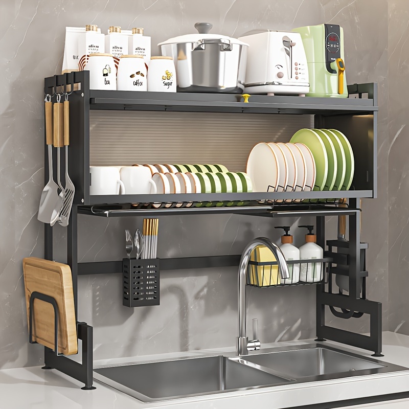 This sleek 2-tier kitchen rack is designed to keep your dishes neatly arranged while saving valuable space.